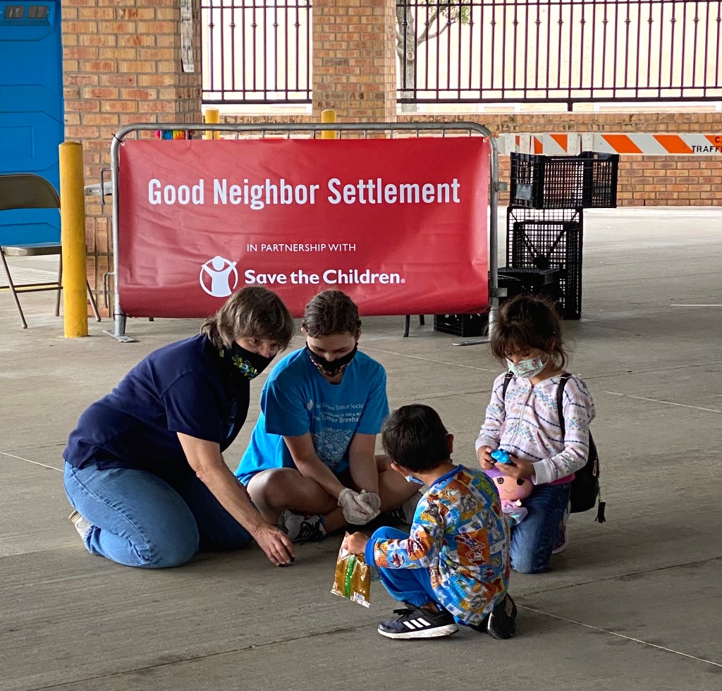 Every day, Team Brownsville volunteers staff several tables and distribute donated and purchased items to the arrivals after they are given a hot meal and have secured their bus tickets.